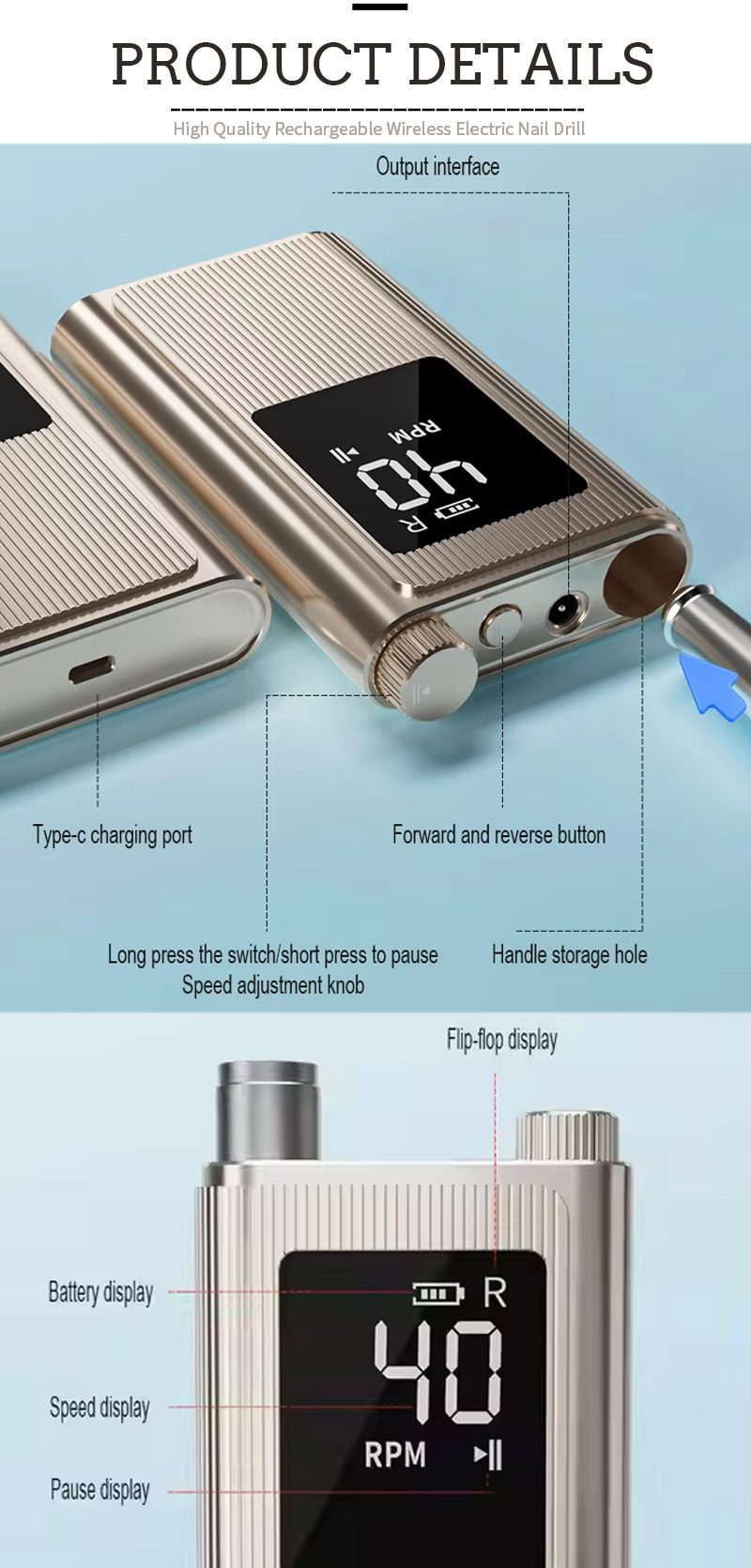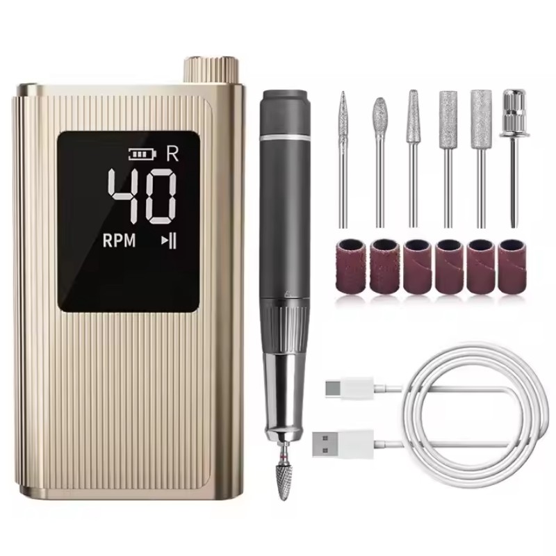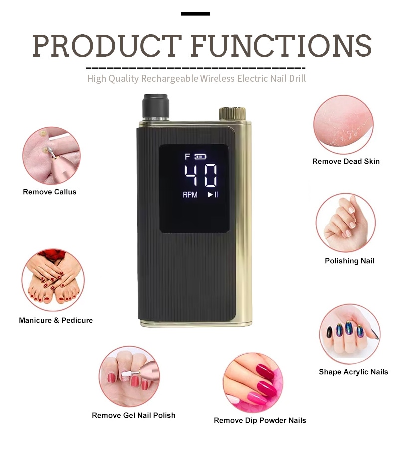 Zaslon tega hitrega profesionalnega vrtalnika za nohte s 40.000 vrtljaji na minuto ima stikalo za vklop/izklop in vrtenje naprej/nazaj za skupno aktivacijo z enim gumbom, vtičnico za hitro polnjenje na dnu, zamenljivo vtičnico za sveder na vrhu in nastavljivo hitrost v treh položajih za zadovoljitev različnih potreb.