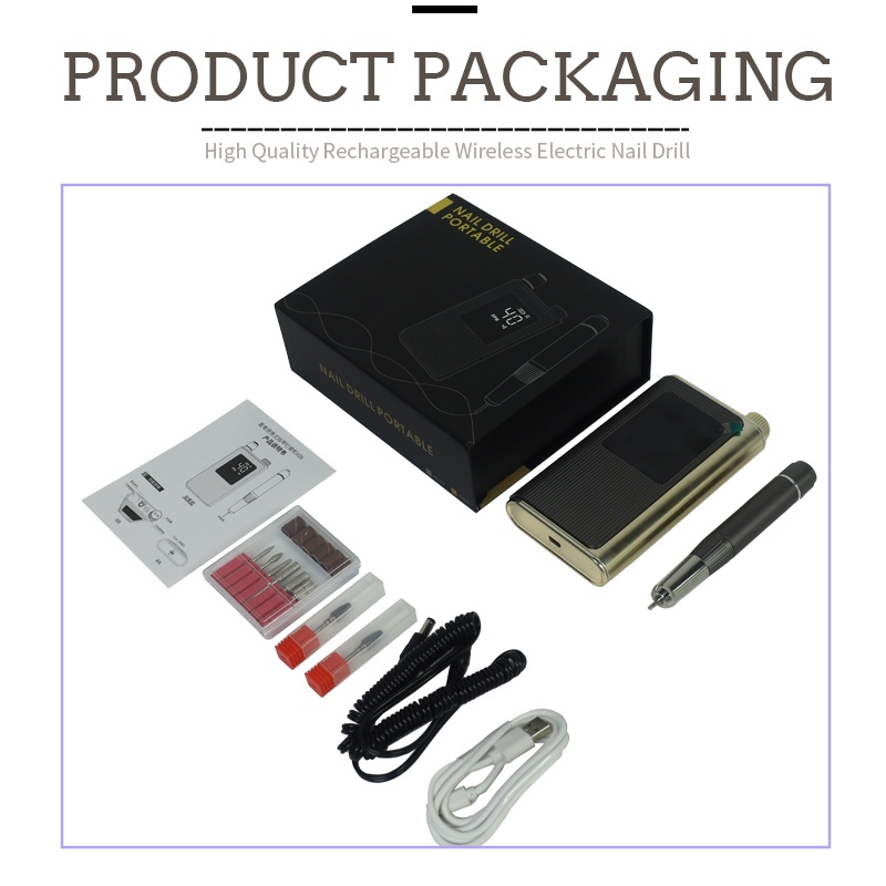 Vsebina tega hitrega profesionalnega svedra za nohte s 40.000 vrtljaji na minuto vsebuje izdelek za brušenje, polnilni kabel USB, priročnik z navodili za uporabo izdelka ter lahko in prenosljivo škatlo.