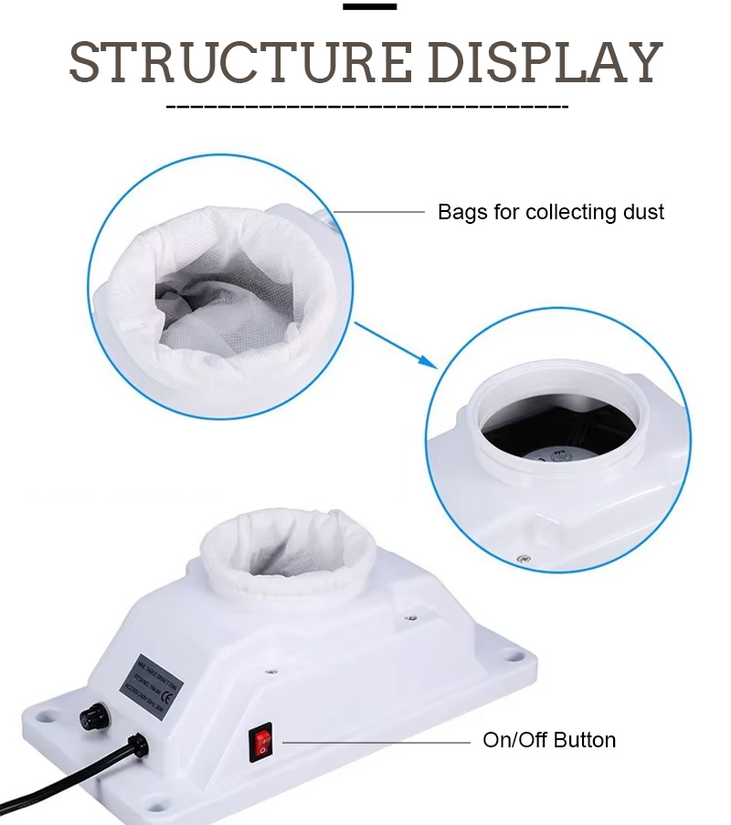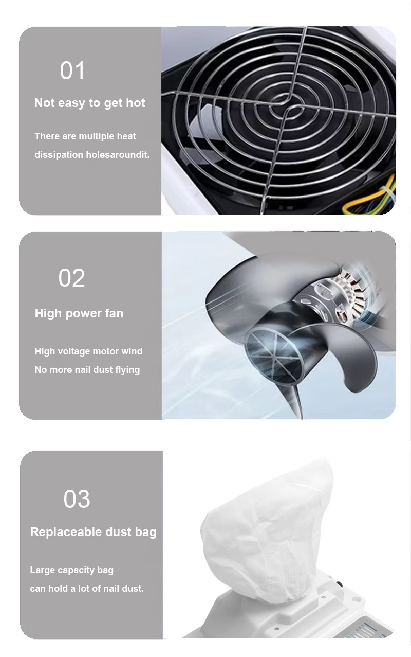 Izdelki močna adsorpcija ostankov nohtov ne pušča prahu, pult naj bo čist in urejen, hitro sesanje ne pušča prahu visoka moč učinkovitejša.