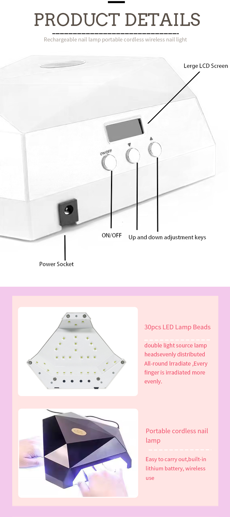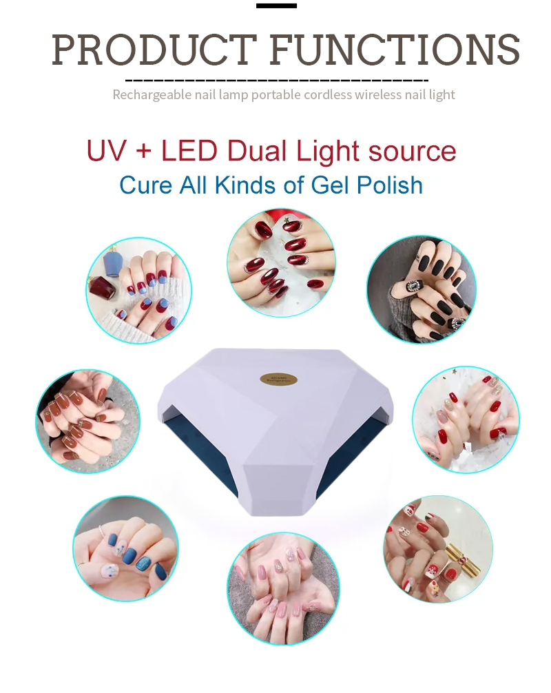 Izdelek zagotavlja celo sušenje lepila brez krčenja. Njeni viri z dvojno svetlobo zagotavljajo rahlo ogrevanje, da preprečijo razbarvanje rok in obremenitev oči, primerni tako za roke kot za noge, kar prinese izjemno hitro sušenje.