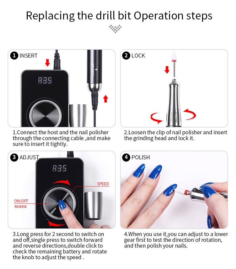 Ta nadomestni električni sveder za nohte s 35.000 vrtljaji na minuto s pilingom deluje, to je, vtakni in izvleci, enostavno in priročno, zamenjava se lahko uporabi po zaključku.