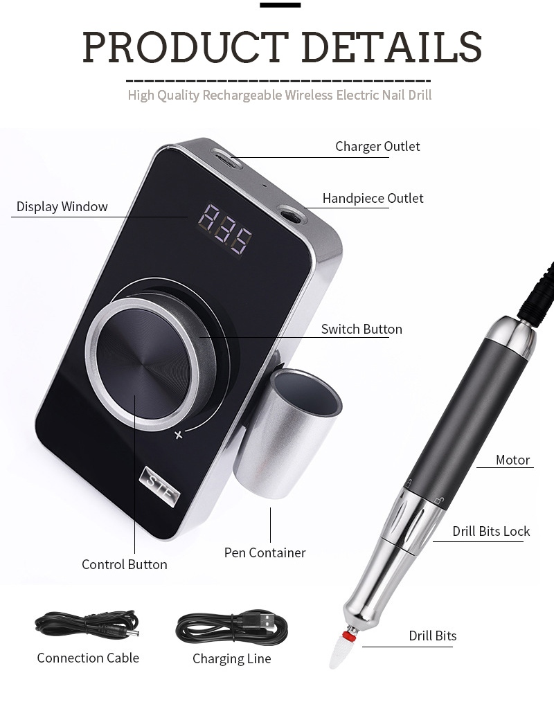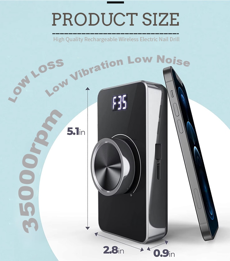 Zaslon tega električnega vrtalnika za nohte s 35.000 vrtljaji na minuto ima stikalo za vklop/izklop in vrtenje naprej/nazaj za skupno aktivacijo z enim gumbom, vtičnico za hitro polnjenje na dnu, zamenljivo vtičnico za sveder na vrhu in nastavljivo hitrost v treh položajih za zadovoljitev različnih potreb.