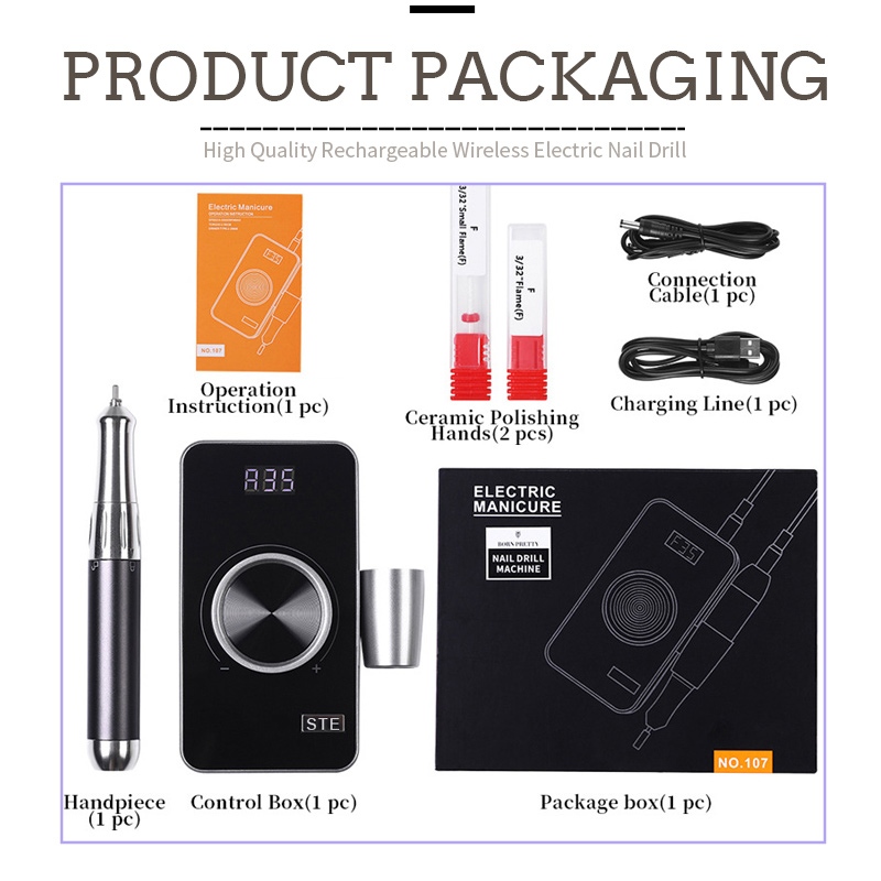 Vsebina tega paketa električnega svedra za nohte s 35.000 vrtljaji na minuto vsebuje izdelek za brušenje, polnilni kabel USB, priročnik z navodili za uporabo izdelka ter lahko in prenosljivo škatlo.