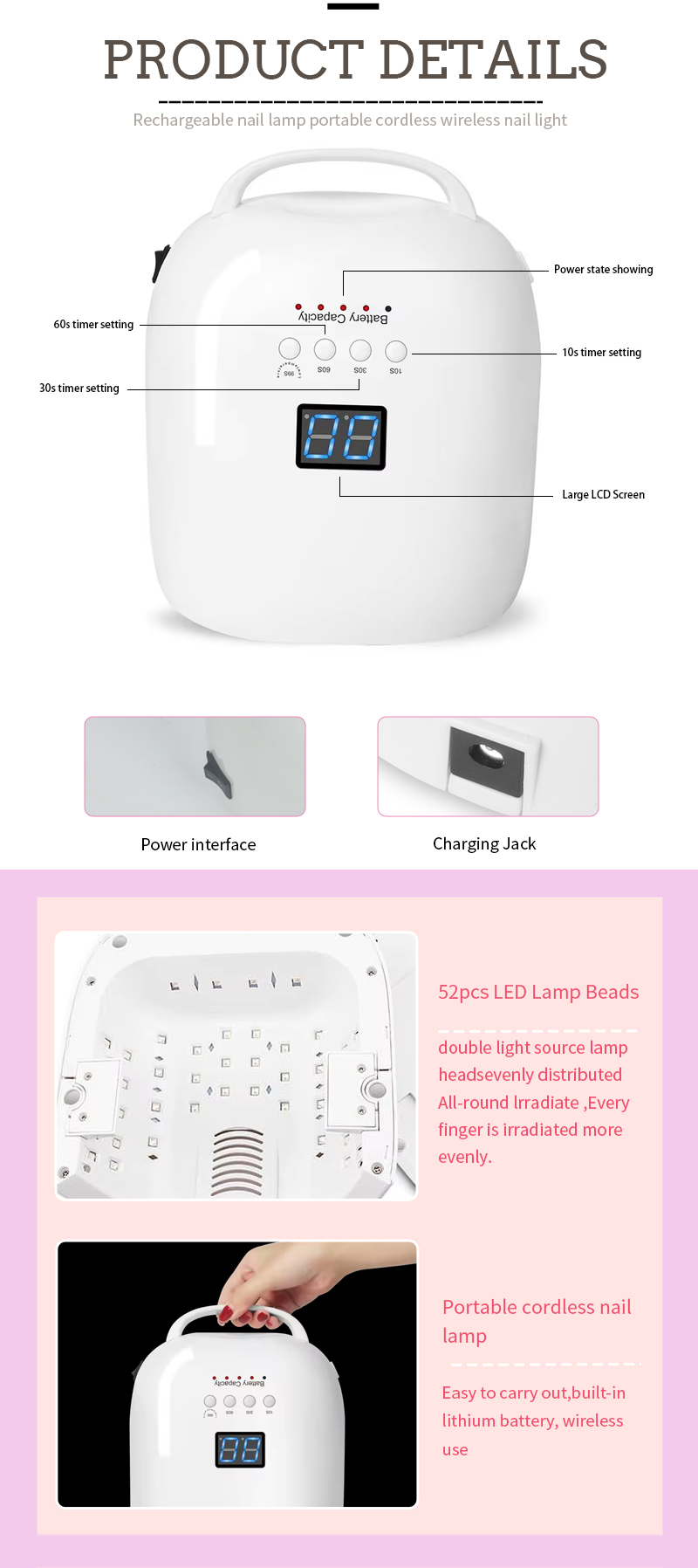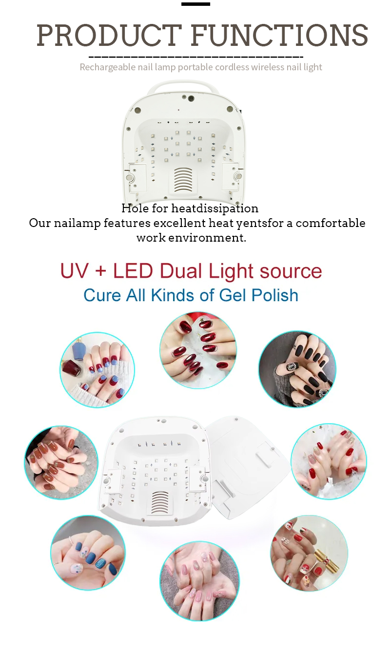 Izdelek zagotavlja celo sušenje lepila brez krčenja. Njeni viri z dvojno svetlobo zagotavljajo rahlo ogrevanje, da preprečijo razbarvanje rok in obremenitev oči, primerni tako za roke kot za noge, kar prinese izjemno hitro sušenje.