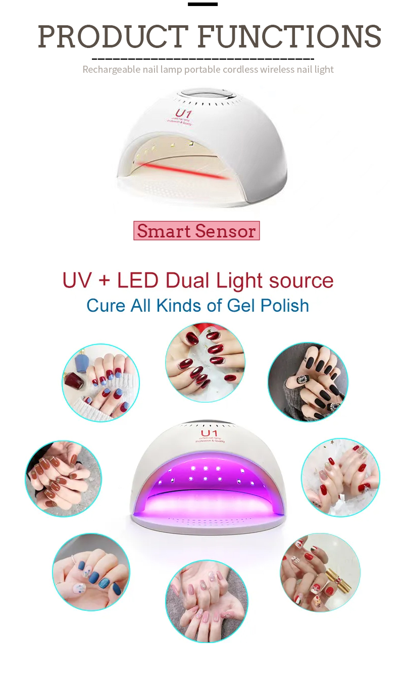 Izdelek zagotavlja enakomerno sušenje lepila brez krčenja. Njena dvojna vira svetlobe zagotavljata nežno ogrevanje, da preprečita razbarvanje rok in obremenitev oči, primerna za roke in noge, kar zagotavlja izjemno hitre rezultate sušenja.
