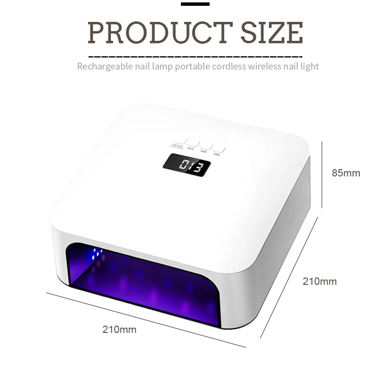 Dimenzije te visokokakovostne svetilke za hitro sušenje nohtov so 210 mm v dolžino, 210 mm v širino in 85 mm v višino, z veliko zmogljivostjo in možnostjo uporabe tako rok kot nog, kar je zelo priročno.