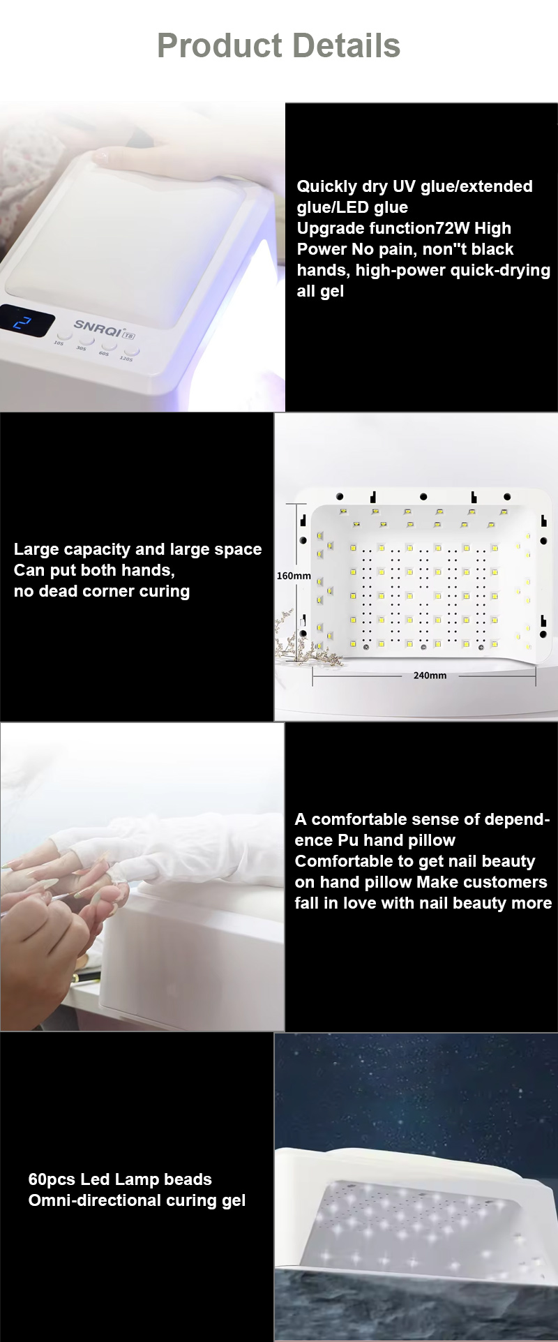 Izdelek zagotavlja enakomerno sušenje lepila brez krčenja. Njena dvojna vira svetlobe zagotavljata nežno ogrevanje, da preprečita razbarvanje rok in obremenitev oči, primerna za roke in noge, kar zagotavlja izjemno hitre rezultate sušenja.
