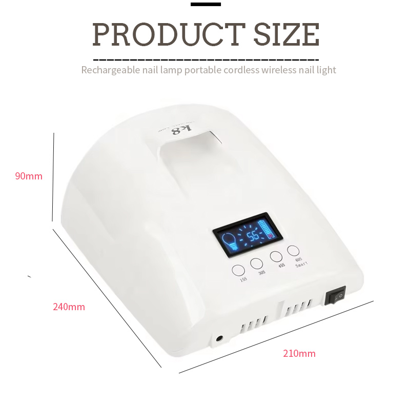 Dimenzije svetilke za sušenje nohtov velike zmogljivosti z ročajem so 205 mm v dolžino, 220 mm v širino in 104 mm v višino, z veliko zmogljivostjo in možnostjo uporabe tako rok kot nog, kar je zelo priročno.