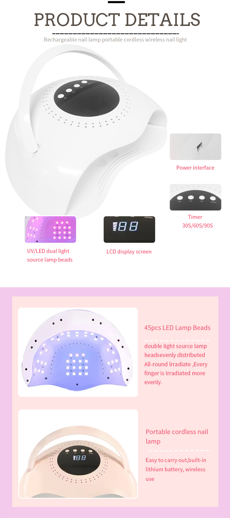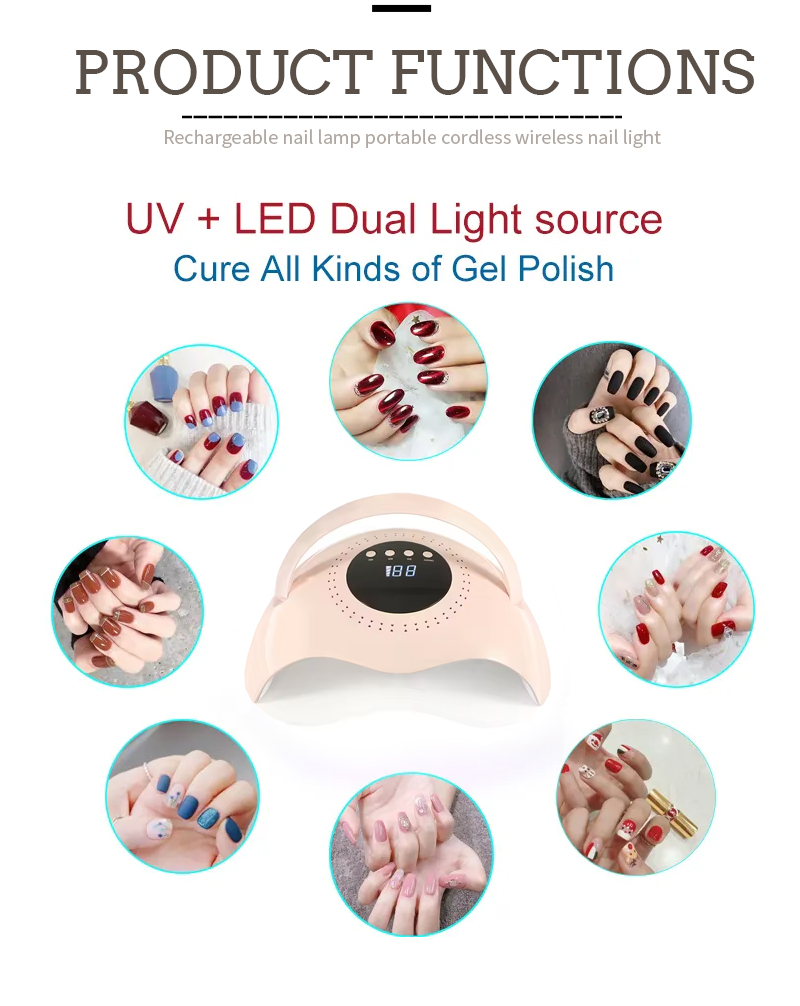 Izdelek zagotavlja celo sušenje lepila brez krčenja. Njeni viri z dvojno svetlobo zagotavljajo rahlo ogrevanje, da preprečijo razbarvanje rok in obremenitev oči, primerni tako za roke kot za noge, kar prinese izjemno hitro sušenje.