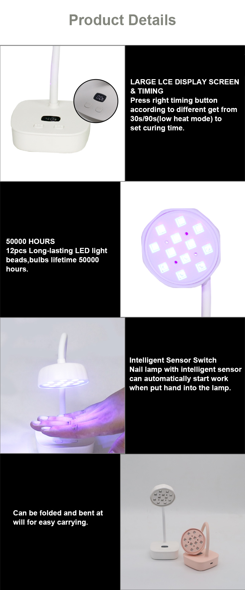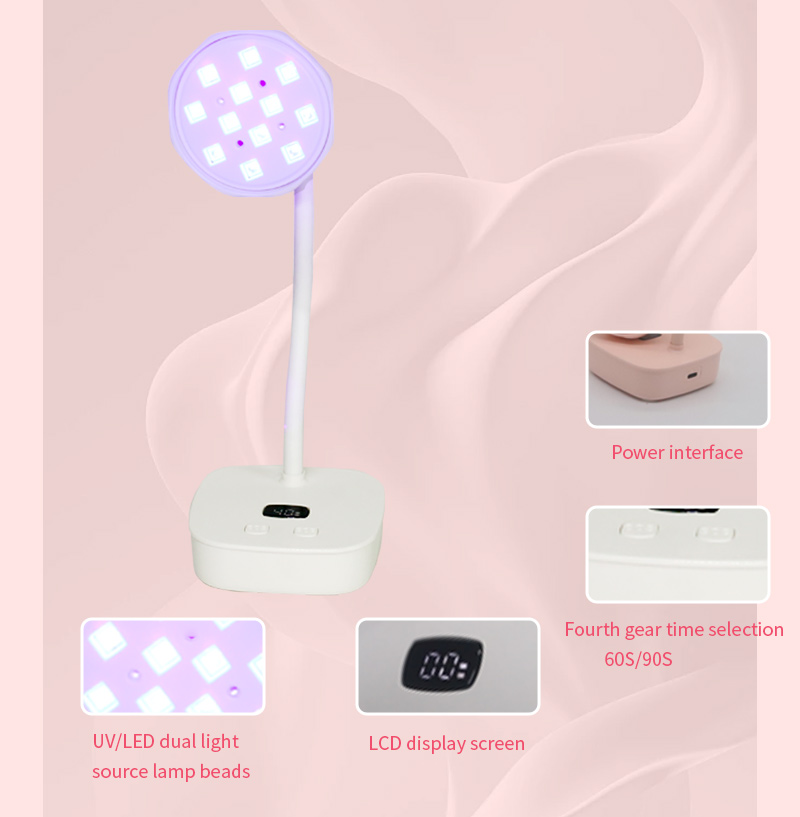 Izdelek zagotavlja enakomerno sušenje lepila brez krčenja. Njena dvojna vira svetlobe zagotavljata nežno ogrevanje, da preprečita razbarvanje rok in obremenitev oči, primerna za roke in noge, kar zagotavlja izjemno hitre rezultate sušenja.