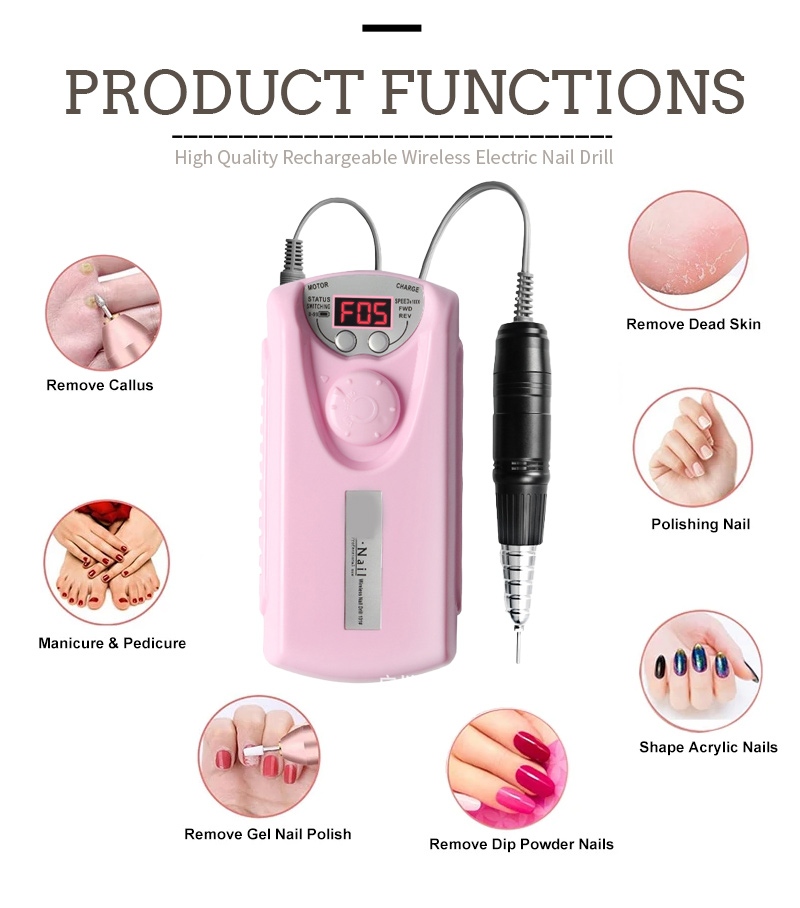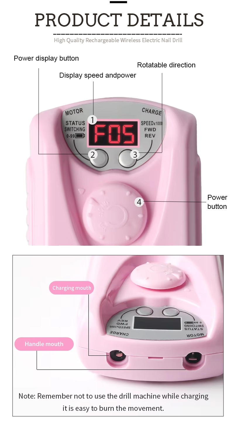 Zaslon tega profesionalnega brezžičnega električnega vrtalnika za nohte ima stikalo za vklop/izklop in vrtenje naprej/nazaj za skupno aktivacijo z enim gumbom, vtičnico za hitro polnjenje na dnu, zamenljivo vtičnico za vrtanje na vrhu in nastavljivo hitrost v treh položajih za zadovoljitev različnih potreb.
