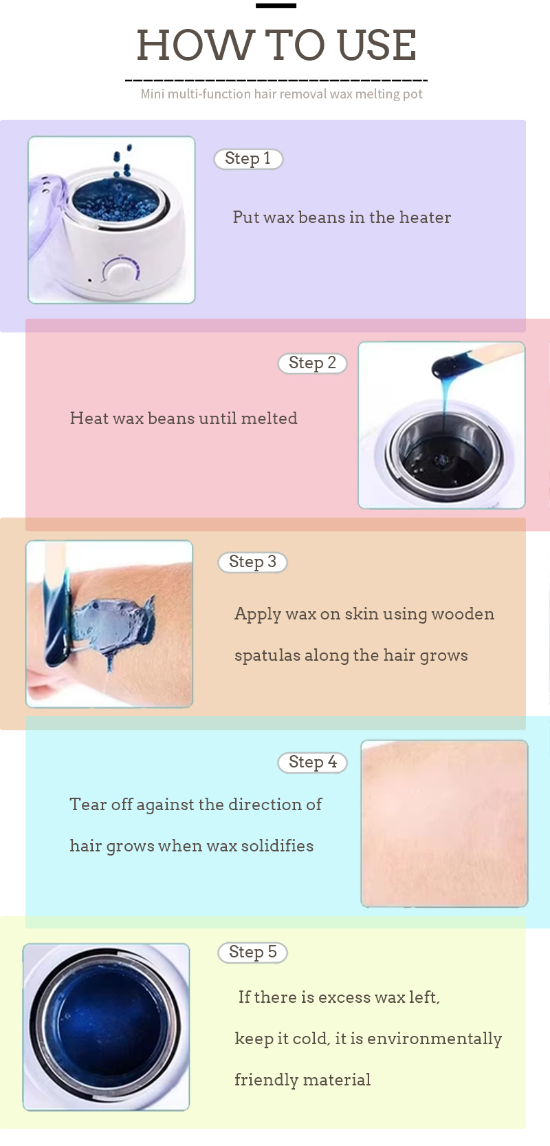 Metoda delovanja voska za depilacijo izdelka, višja kot je temperatura, hitreje se vosek topi, nižja kot je temperatura, počasneje se vosek topi, najprej vlijemo v ustrezno količino zrn voska za depilacijo, segrevamo, dokler se zrna voska ne stopijo, nato depilacijske dele enakomerno prevlečenega depilacijskega voska in na koncu odtrgamo v nasprotni smeri rasti dlak.
