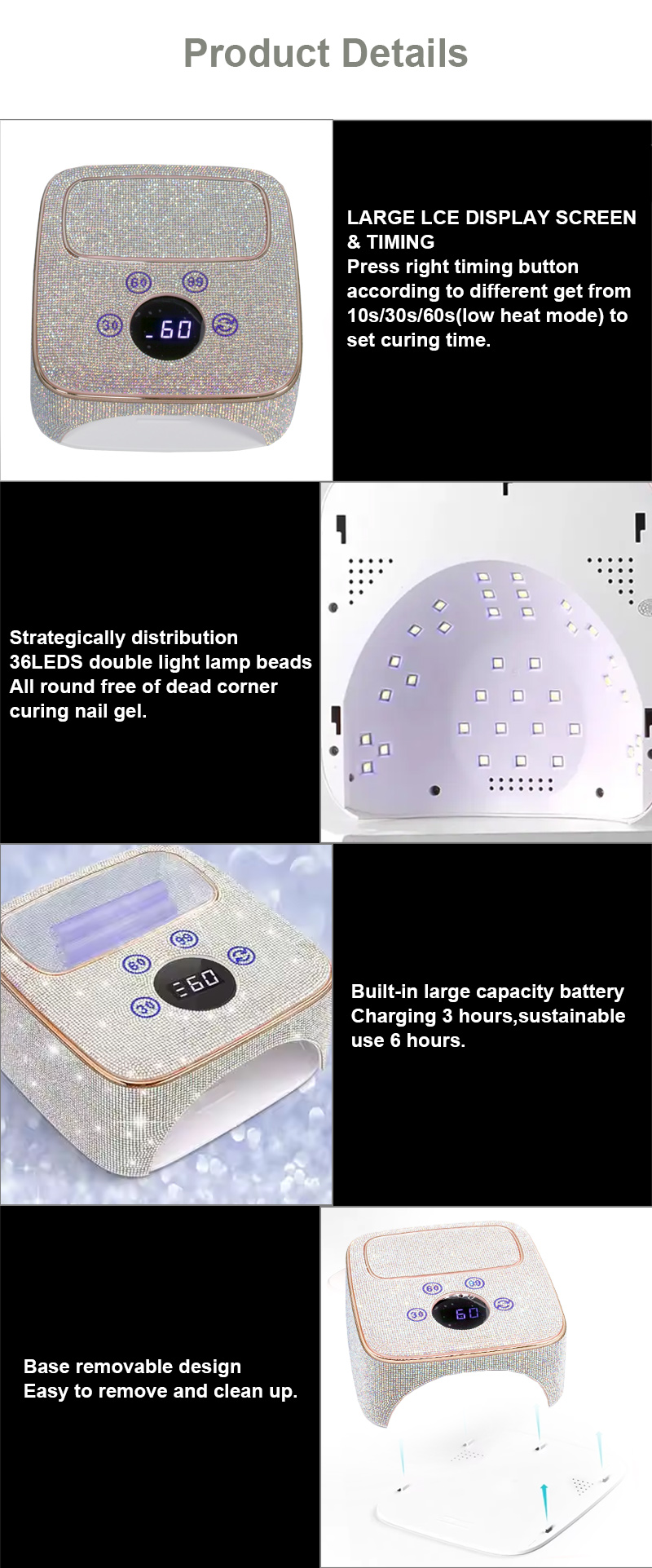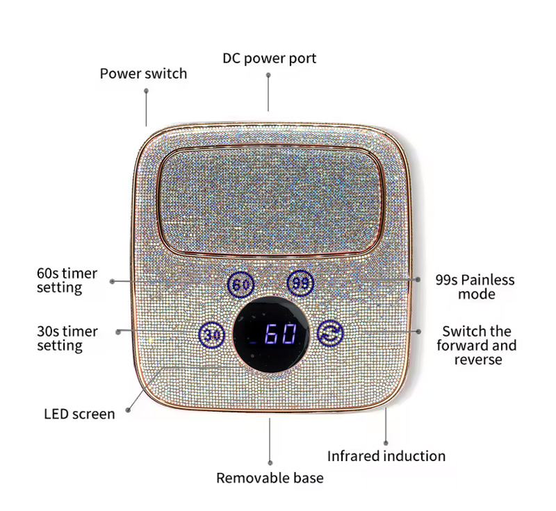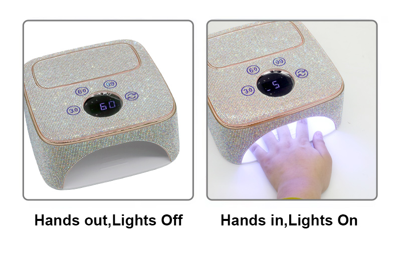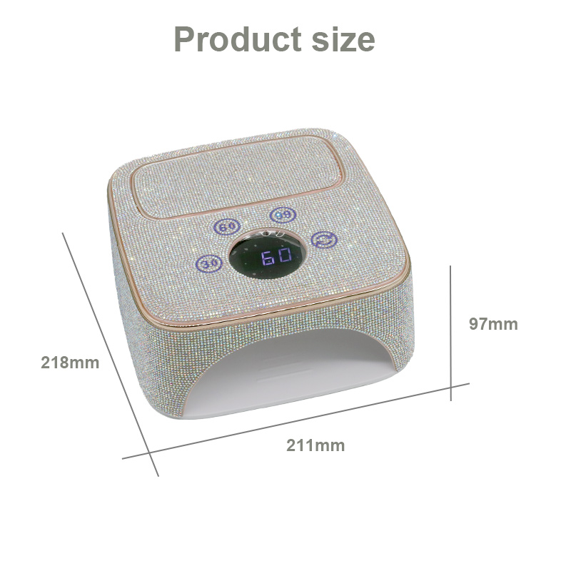 Izdelek zagotavlja enakomerno sušenje lepila brez krčenja. Njena dvojna vira svetlobe zagotavljata nežno ogrevanje, da preprečita razbarvanje rok in obremenitev oči, primerna za roke in noge, kar zagotavlja izjemno hitre rezultate sušenja.
