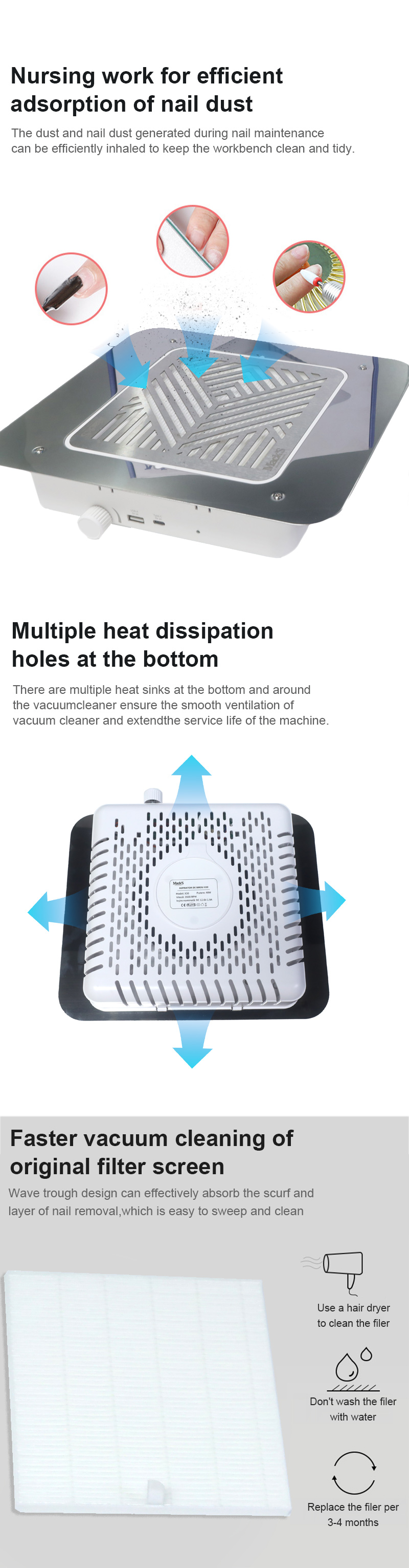 Izdelki močna adsorpcija ostankov nohtov ne pušča prahu, naj bo pult čist in urejen, hitro sesanje ne pušča prahu visoka moč učinkovitejša.