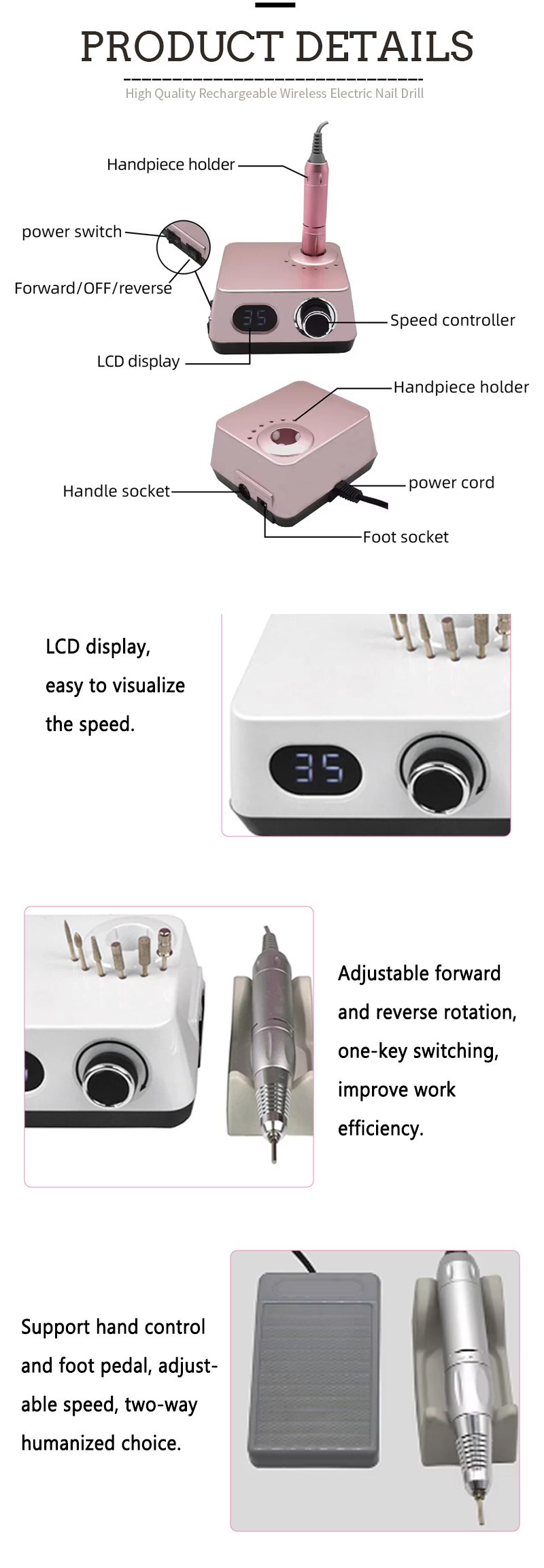 Zaslon tega brezžičnega električnega vrtalnika za nohte s 35.000 vrtljaji na minuto ima stikalo za vklop/izklop in vrtenje naprej/nazaj za skupno aktivacijo z enim gumbom, vtičnico za hitro polnjenje na dnu, zamenljivo vtičnico za sveder na vrhu in nastavljivo hitrost v treh položajih za izpolnjevanje različnih potreb.